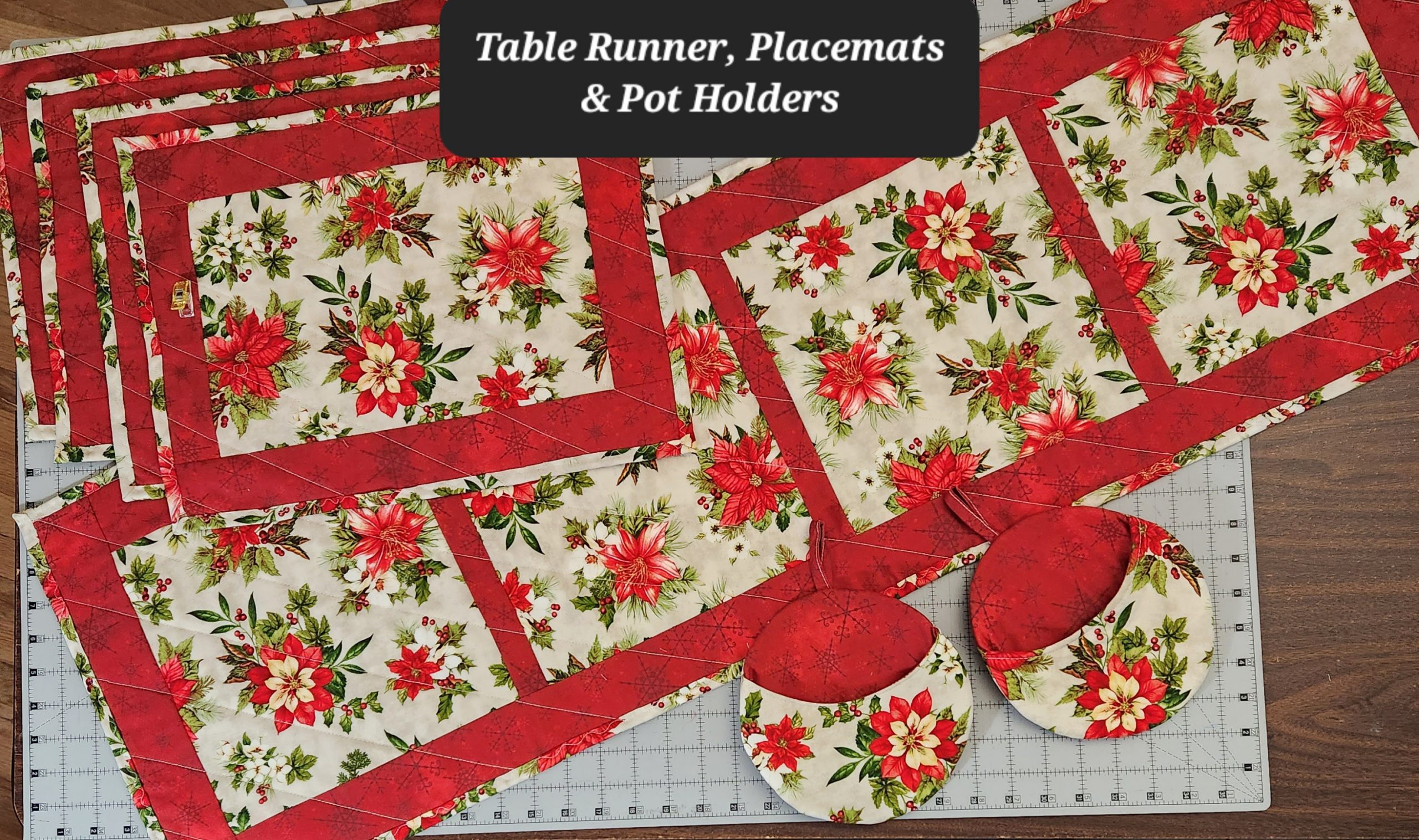 Table Runner & Placemats 100% cotton fabric & 100% cotton batting. Oven Mitts 100% Cotton Fabric, One (1) layer 100% cotton batting with two (2) layers of Insul-Bright. Not for use in Microwave due to the metallic heat absorbing material that protects your hands from oven hot dishware. Handcrafted in a clean smoke free & pet free studio. Free shipping in continental USA.