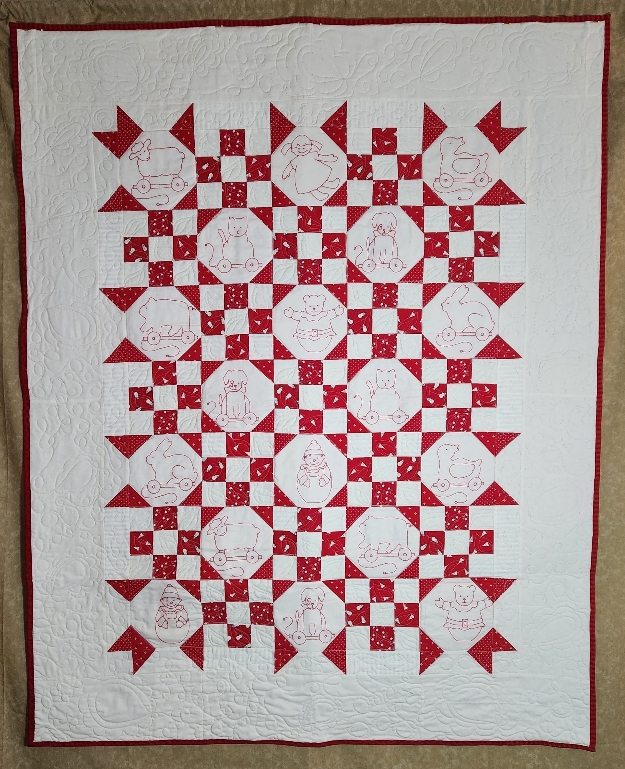 Toyland Quilt measures 46″ x 58″. Each of the 20 toy silhouettes are hand embroidered, 18 on the quilt and 2 on the pillow cover. Pattern is from Better Homes & Gardens Quilt-Lovers Favorites, Volume 1, pages 47-59. Materials used are 100% cotton fabrics, with a 100% cotton batting. Backing fabric is red with a column of patchwork fabrics matching the quilt front fabrics. The included pillow cover measures 14″x 14″ (A pillow insert may be purchased separately on Amazon or a local fabric store.) Longarm quilting by kathy@sewingstudiollc.com based on a variety of basic quilting patterns inspired by Angela Walter of Quilting is My Therapy.  Handcrafted in a clean smoke free & pet fee studio. Free Shipping in the Continental USA.