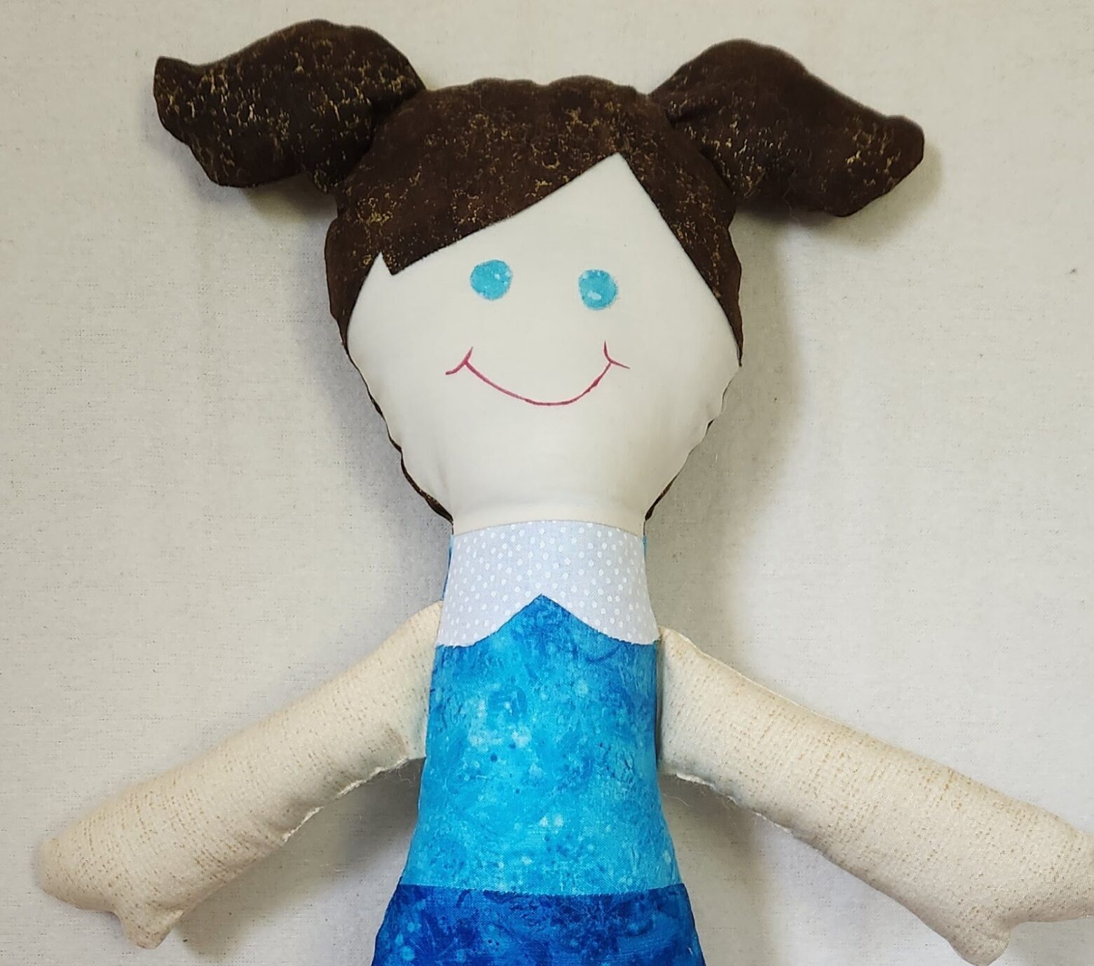 Materials: 100% cotton fabric with sewn on applique features, filled with POLY-FIL 100% premium doll stuffing material. Design by Antonie Alexander’s Happy Quilts pattern book. Handcrafted in a clean smoke free & pet free studio. Free shipping in continental USA.